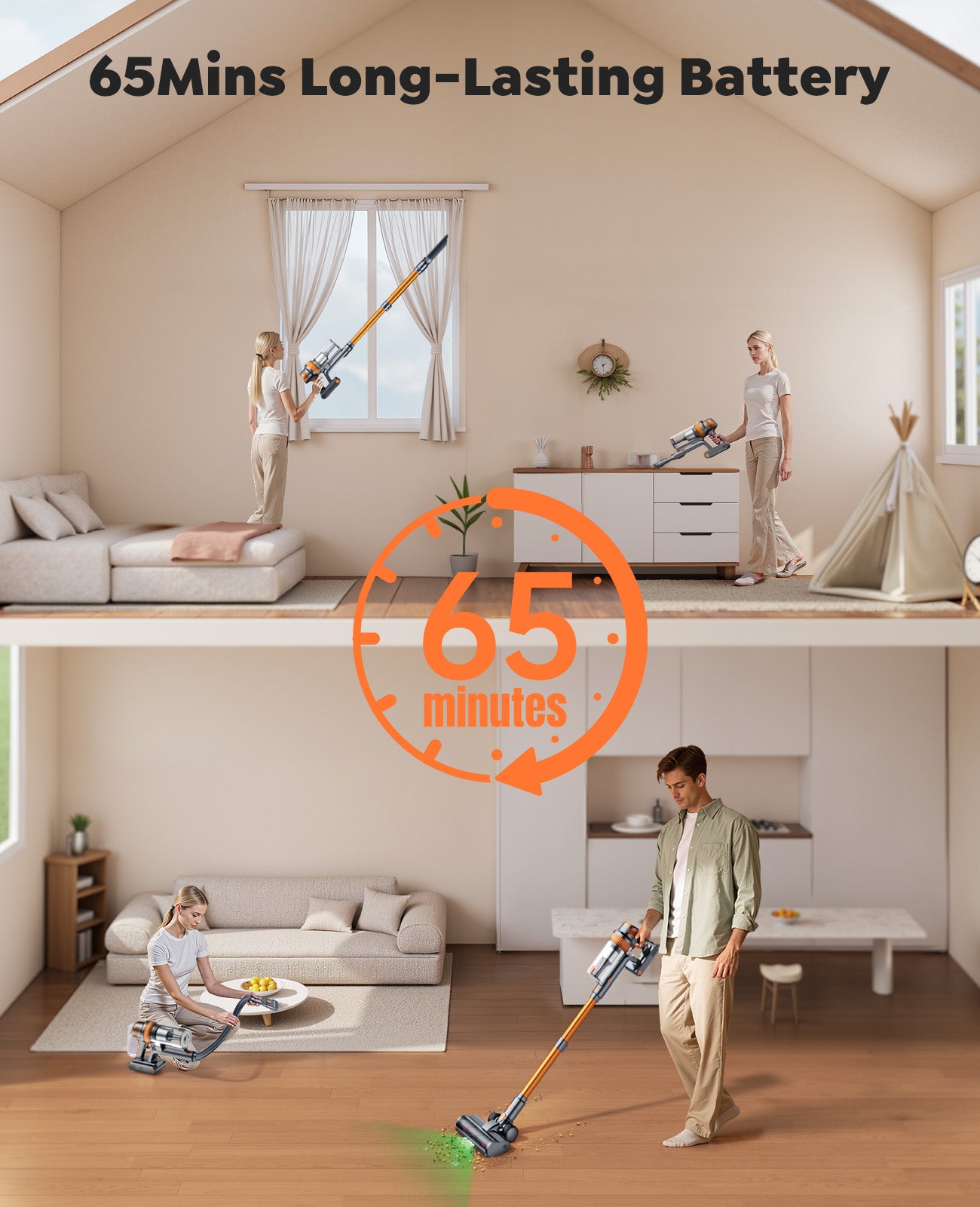 ✨【65-Minute Extended Runtime】With 8 built-in high-capacity batteries,This vacuum cordless provide up to 65 minutes of runtime in Eco mode (25-30 mins in Max), perfect for all-around cleaning needs. The second battery can be purchased separately in the store to double the runtime.
